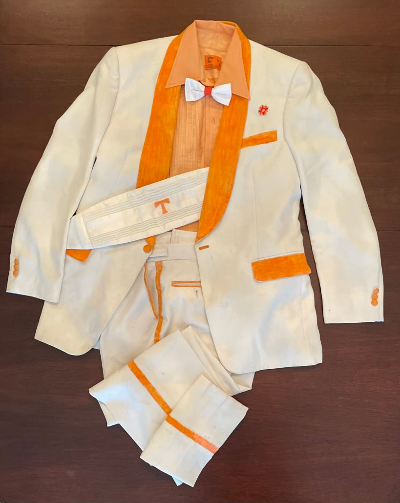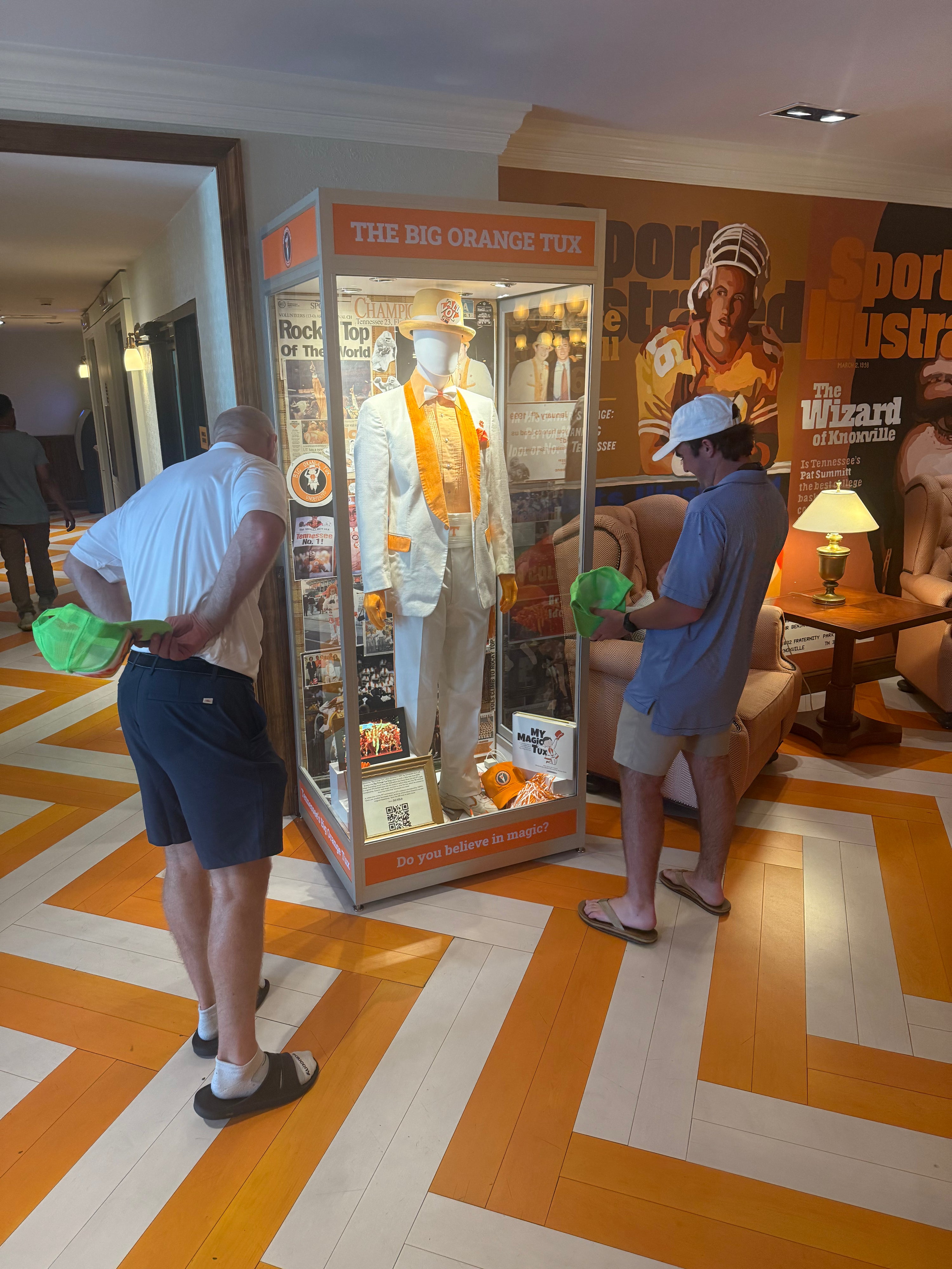 The original Big Orange Tux, the suit that started it all, is now proudly displayed at The Graduate Hotel in Knoxville. Preserved as a piece of Tennessee fan history, it celebrates an unforgettable game-day spirit and the legendary energy of Vol Nation.